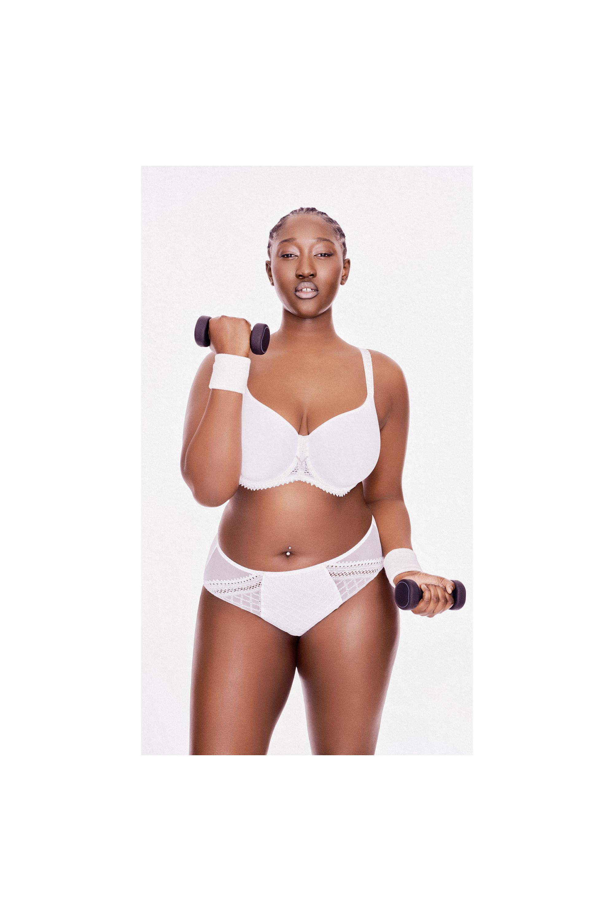 Aminata ist 176 cm groß und trägt BH-Größe 100E und Unterteile in Größe 42 (französische Größen).