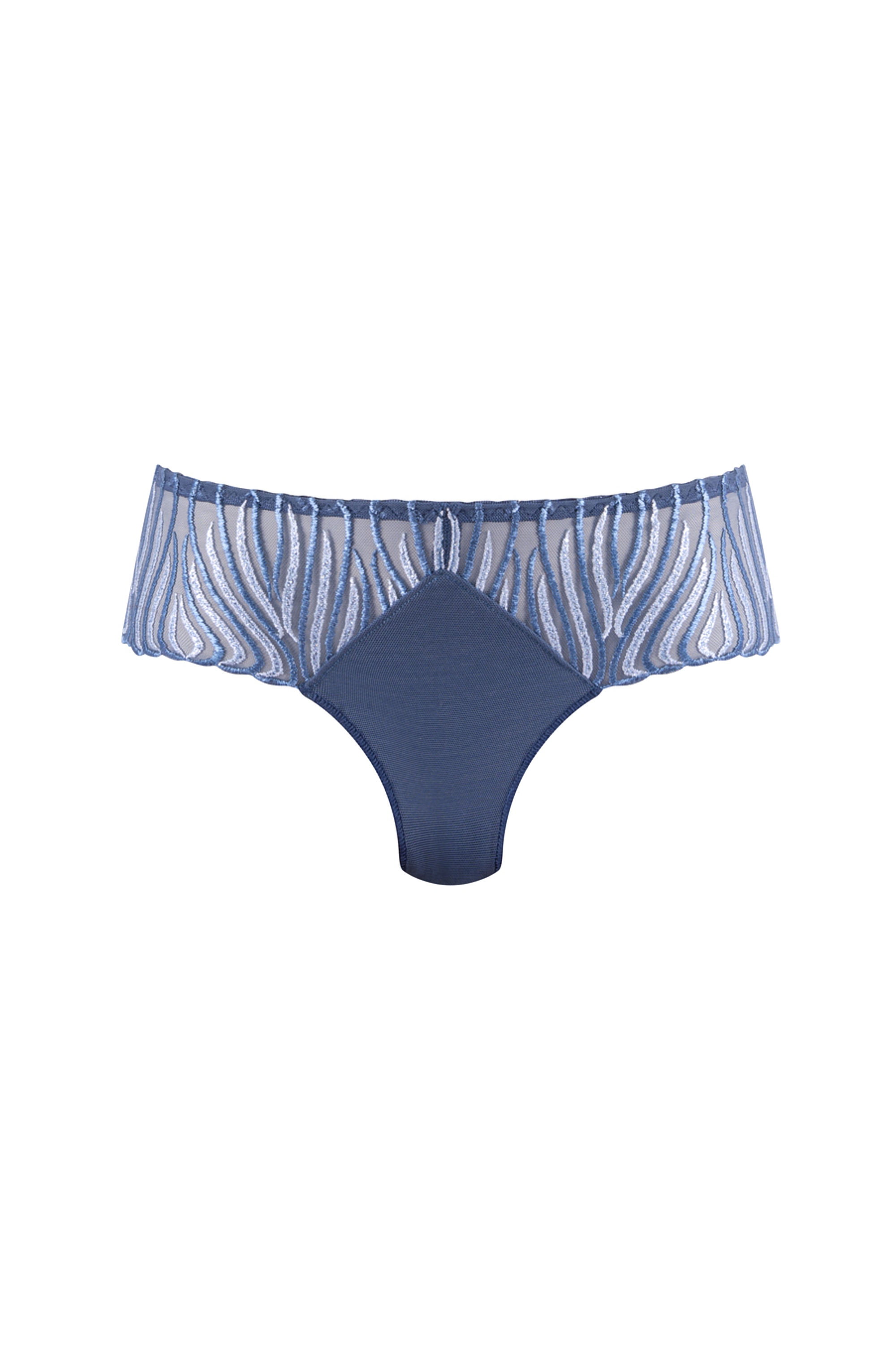 The Astral Rays collection is inspired by the aesthetic and spiritual world of an astral journey. Its hypnotic embroideries, composed of ribbed waves in shades of blue and grey, reflect this idea of an inner journey while adding a graphic and captivating touch to the line.