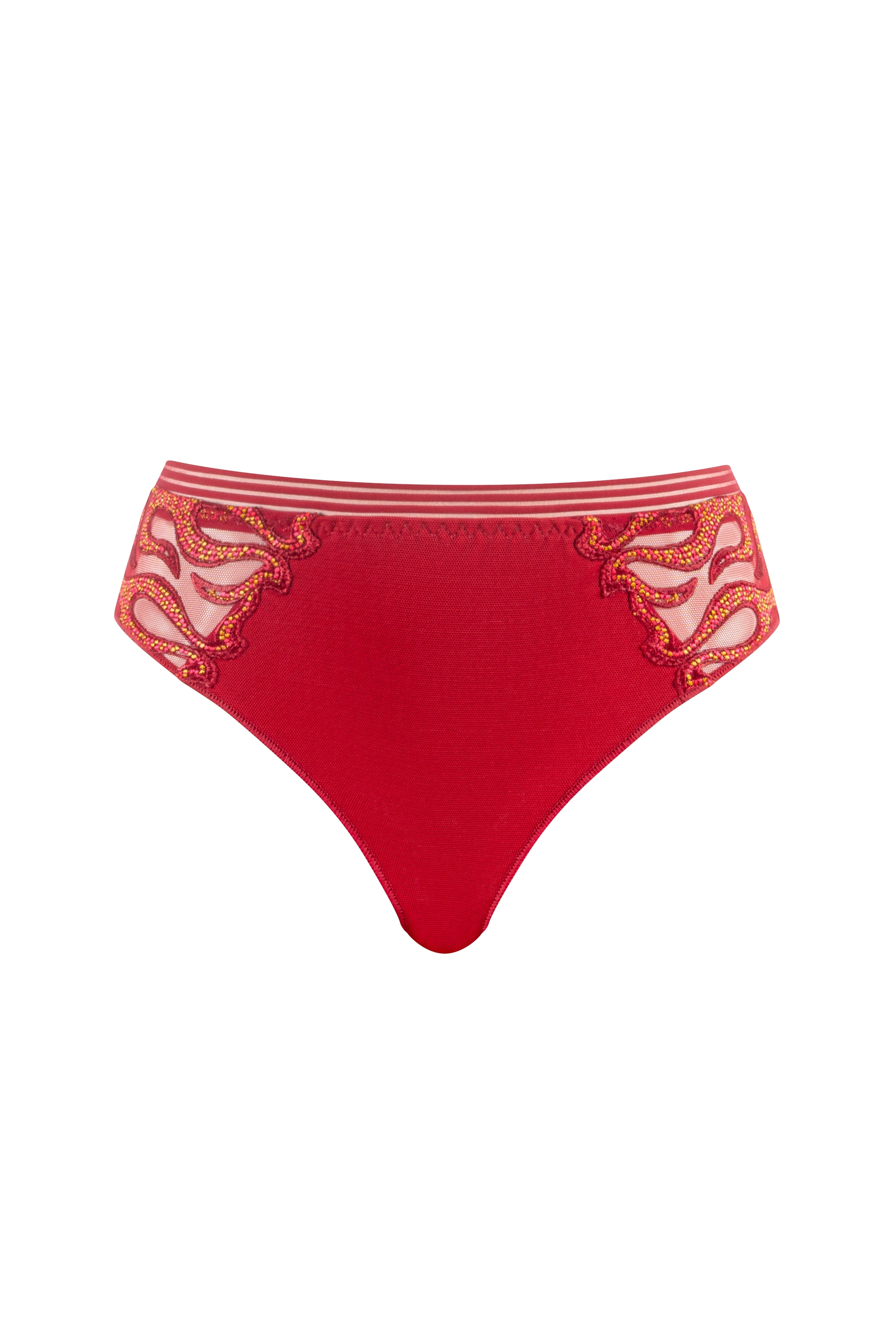 The Burning Love line embodies refined eroticism with a touch of extravagant sensuality. Its highly visual flame-patterned embroidery features two-tone green and yellow stitching for a captivating effect.