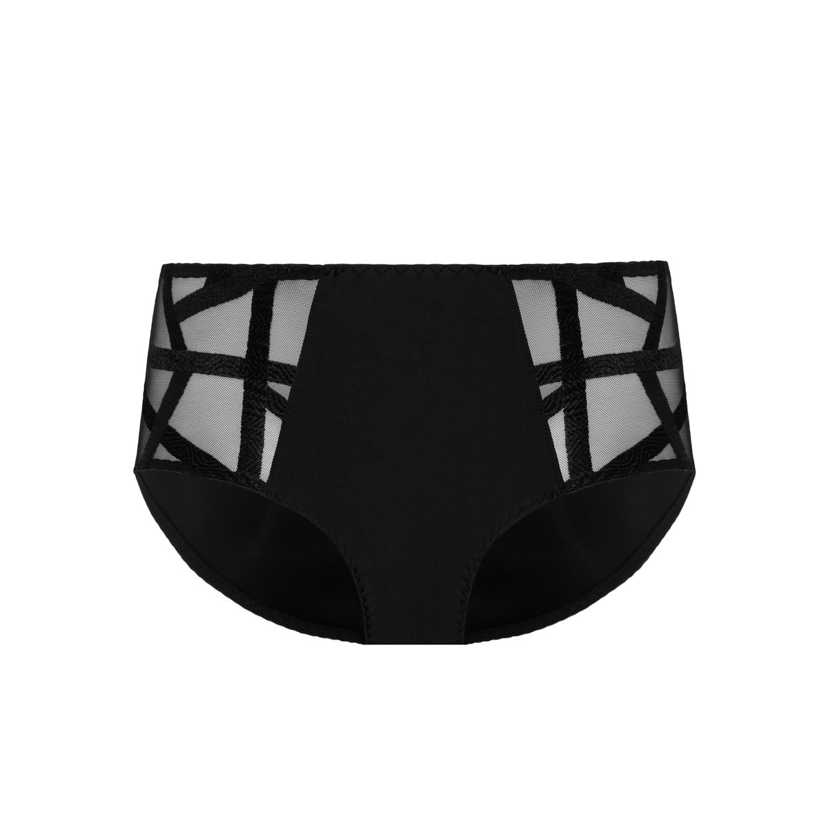 Série verleidt met zijn geometrische en zeer vrouwelijke uitstraling. De lijn combineert borduurwerk met chevron- en golfmotieven, die doen denken aan leren bandjes, met bi-stretch satijnen stof voor een grafisch en sensueel effect.