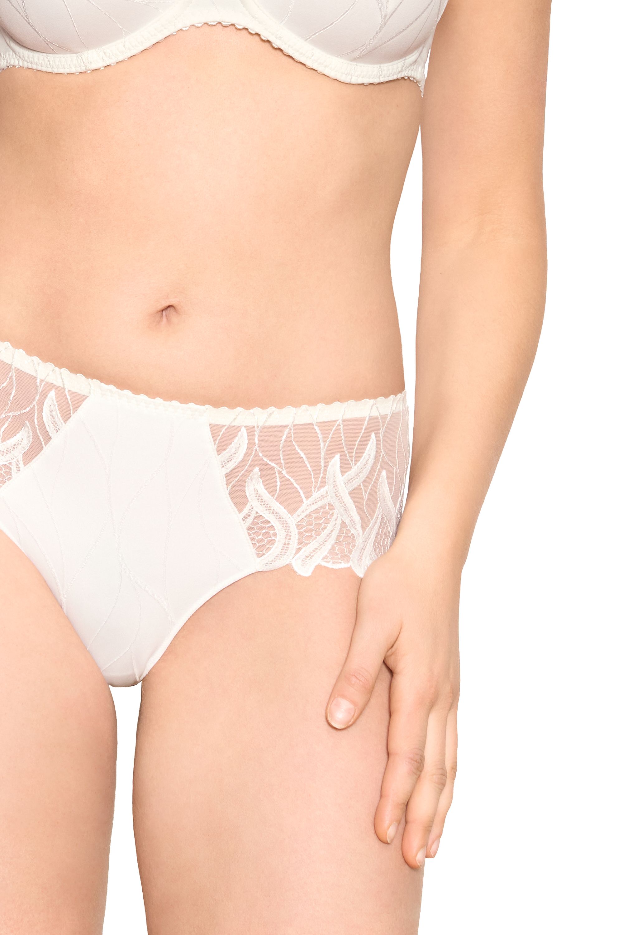Julia Sublieme de vrouwelijke rondingen dankzij een borduurwerk met flamboyante verticale lijnen en een subtiel verzwakte transparantie met een patroon van een "honingraat". Dit motief strekt zich uit tot een Franse tonic jacquard, waarmee het handhaven, comfort en elegantie worden gehandhaafd. Een grote lijn die esthetiek en prestaties combineert.